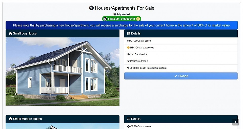 @ Property Market - Successfully purchased a new house. House Type : "Small Modern House" Cost : 50,000 CPSD.