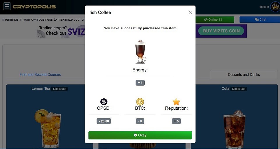 @ Restaurant - Purchase of Irish Coffee to replenish Energy.